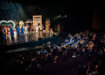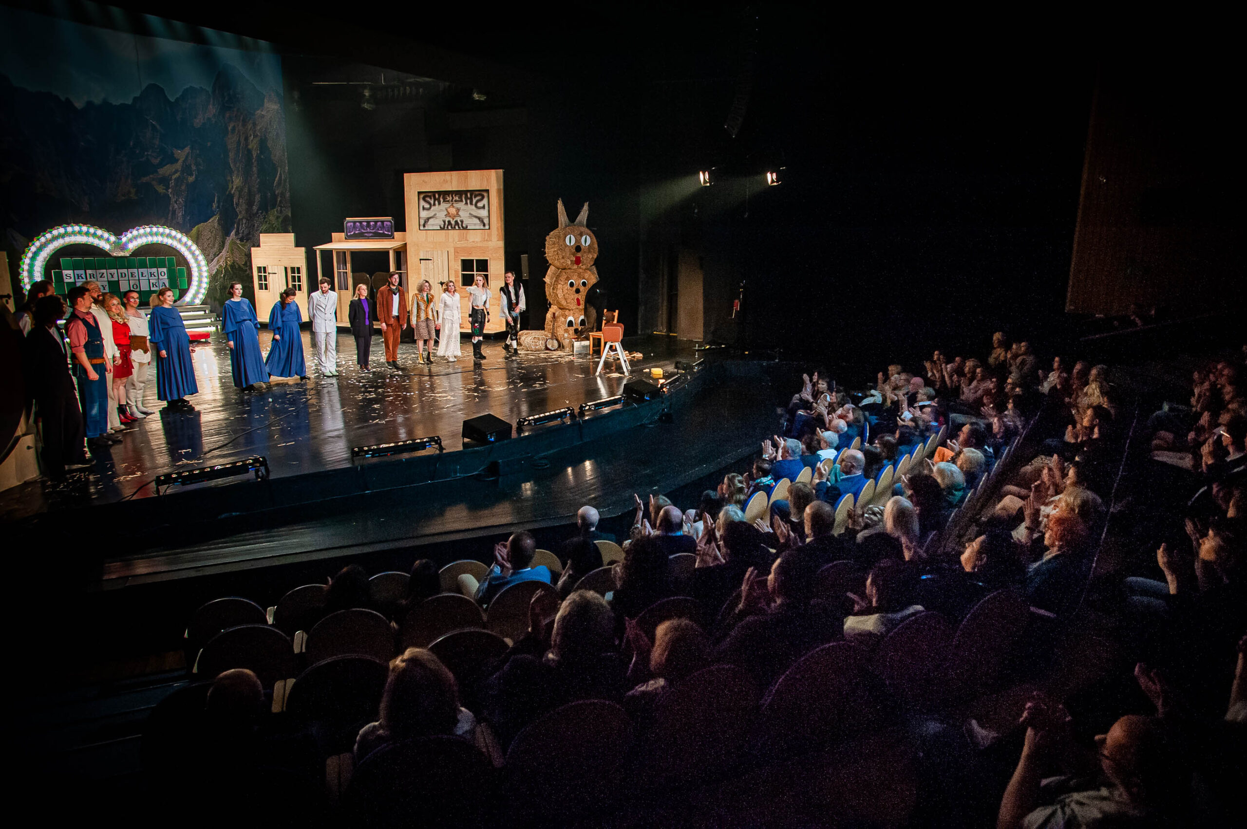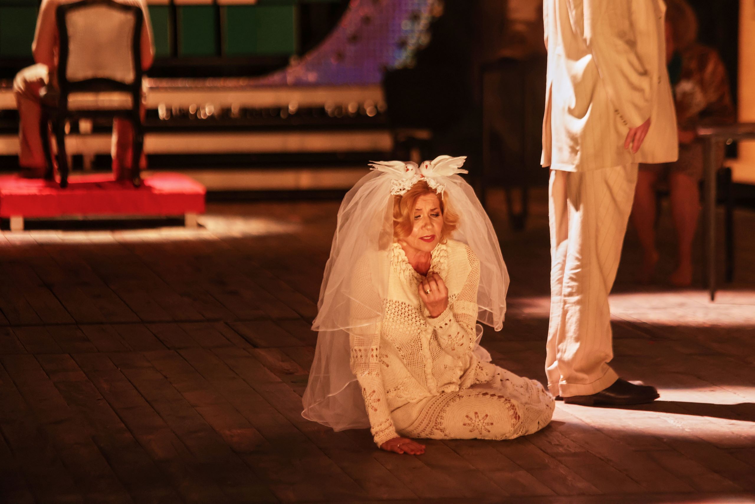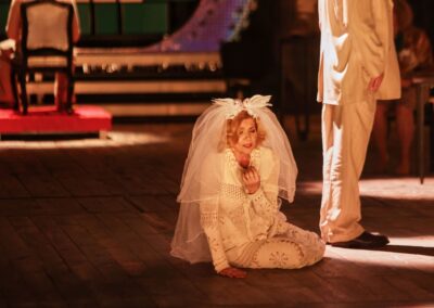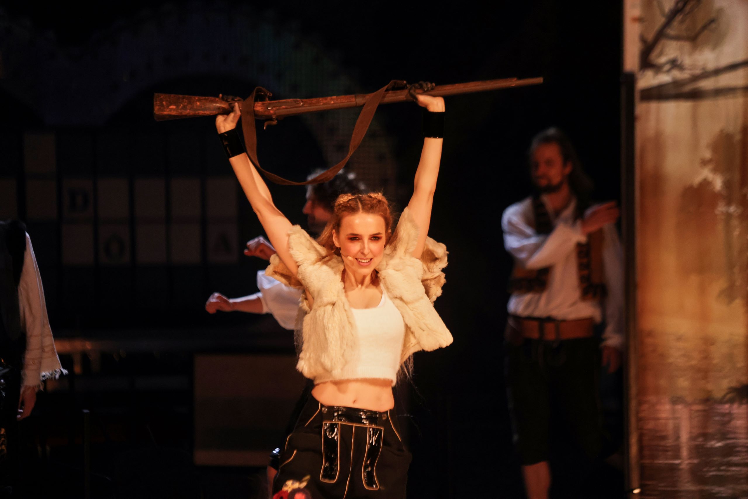 Na scenie od początku dużo się dzieje. Widzimy m.in. wspomnianą już wcześniej stylistykę westernową, przejawiającą się w scenografii, kostiumach i muzyce, koło fortuny ze zgadywanym przez całe przedstawianie hasłem oraz dużo świateł i kolorów. Podstawowa oś fabularna jest dość prosta – perypetie miłosne dwójki młodych Jonka (Dominika Stroki) i Basi (Katarzyny Zawiślak-Dolny, Agnieszki Kościelniak, Aliny Szczegielniak) oraz kochającej się w Jonku macochy Basi, czyli Doroty (Eweliny Cassette). Do tego dochodzi konflikt między Krakowiakami, a Góralami po zerwanych zaręczynach Basi z Góralem Bryndasem (Antoni Milancej). Rozterki i popisy bohaterów zapewniają dobrą zabawę. Bardzo spodobał mi się zabieg przedstawiania Basi jako 3 bohaterek – Basi, Basi i Basi. Basie wszędzie chodziły razem i zachowywały się jak jedna postać, ale w trzech wcieleniach. W rozmowie po spektaklu twórcy nawiązali do tego i opowiedzieli, że chcieli pokazać uniwersalność losu młodej Basi, który może spotkać wiele kobiet. Moim zdaniem wypadło to naprawdę ciekawie. Kolejną ważną postacią jest student Bardos (Daniel Malchar), który opowiada swoją historię i komentuje wydarzenia w Mogile. Już w otwierającej scenie słyszymy o coming-oucie, którego nie dokonał. Wątek tożsamości queerowej, reprezentowanej przez Bardosa jest ważnym punktem spektaklu. Możemy odczytać swoisty apel twórców o tolerancję i równość. W tekście pochodzącym z oryginalnego libretta z XVIII w. mieści się cytat “(…) nie ma zysku w takim boju, który krzywdę czyni bratu” i w kontekście osób nieheteronormatywnych te słowa nabierają szczególnie mocnego znaczenia. Sami twórcy w rozmowie podkreślali, że mamy taki postulat zapisany w operze narodowej i chcieli, aby wybrzmiał on odnoście współczesnej sytuacji. Kolejnym akcentem współczesnym jest wątek starości uosabianej przez Starą Babę (Lidię Bogaczównę). Jest to postać wprowadzona dodatkowo i swoje 5 minut dostaje dopiero na końcu w poruszającym monologu.
