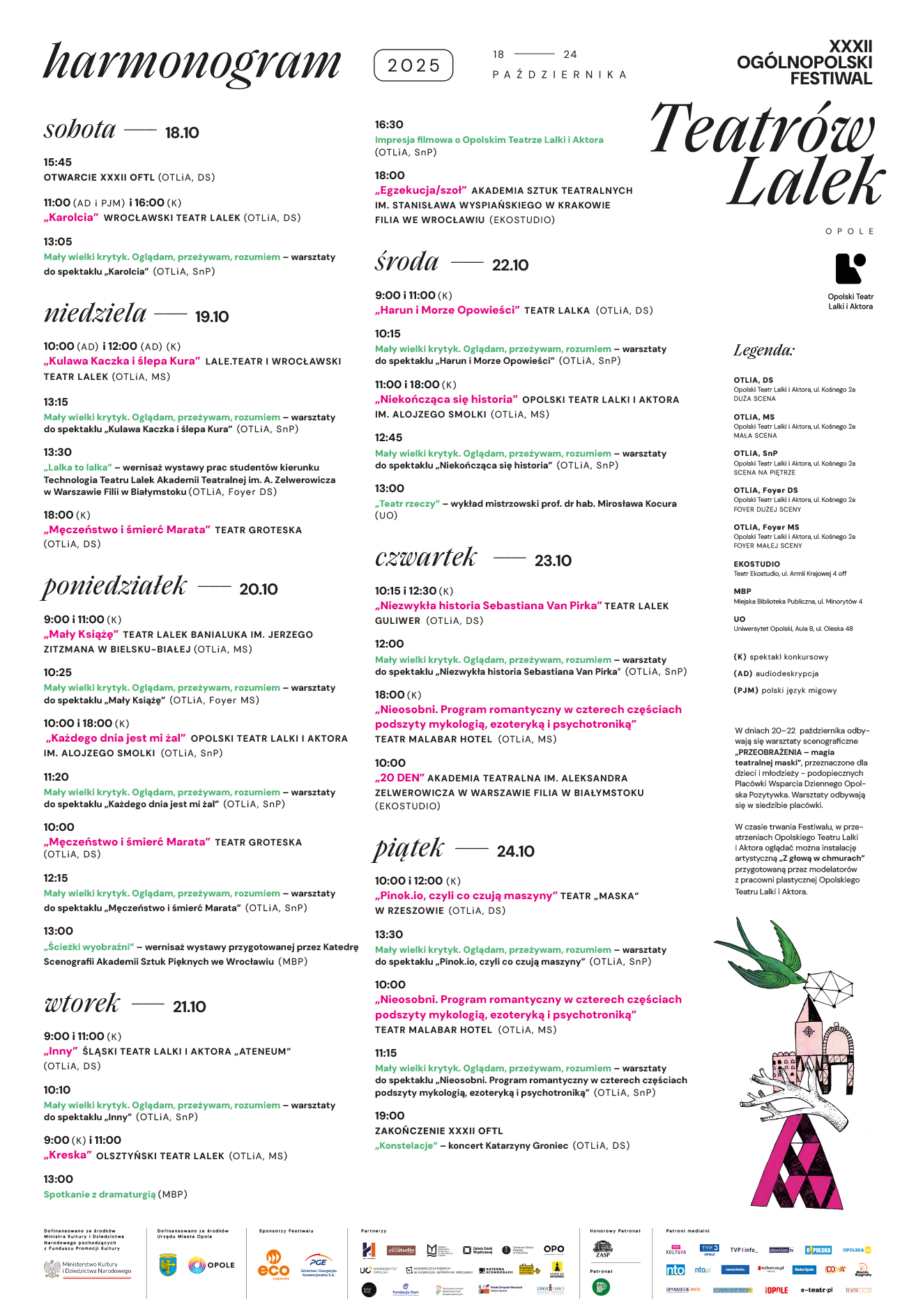 Szczegółowy program, harmonogram i bilety dostępne są na stronie internetowej teatru. XXXII OFTL – Opolski Teatr Lalki i Aktora im. Alojzego Smolki